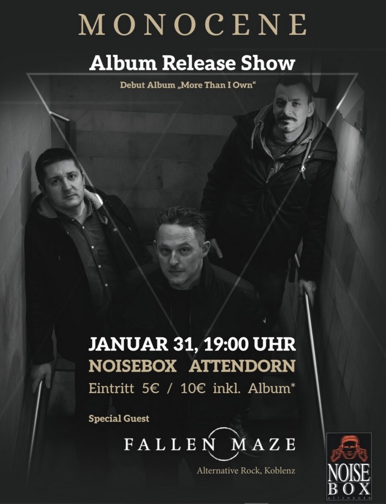 Attendorn darf sich auf einen intensiven Konzertabend freuen: Am 31. Januar 2026 laden Monocene zur offiziellen Release Party ihres Studioalbums „More Than I Own“ in die NoiseBox ein. Mit dabei sind Fallen Maze, die den Abend als Support eröffnen und das Publikum schon früh auf Betriebstemperatur bringen.