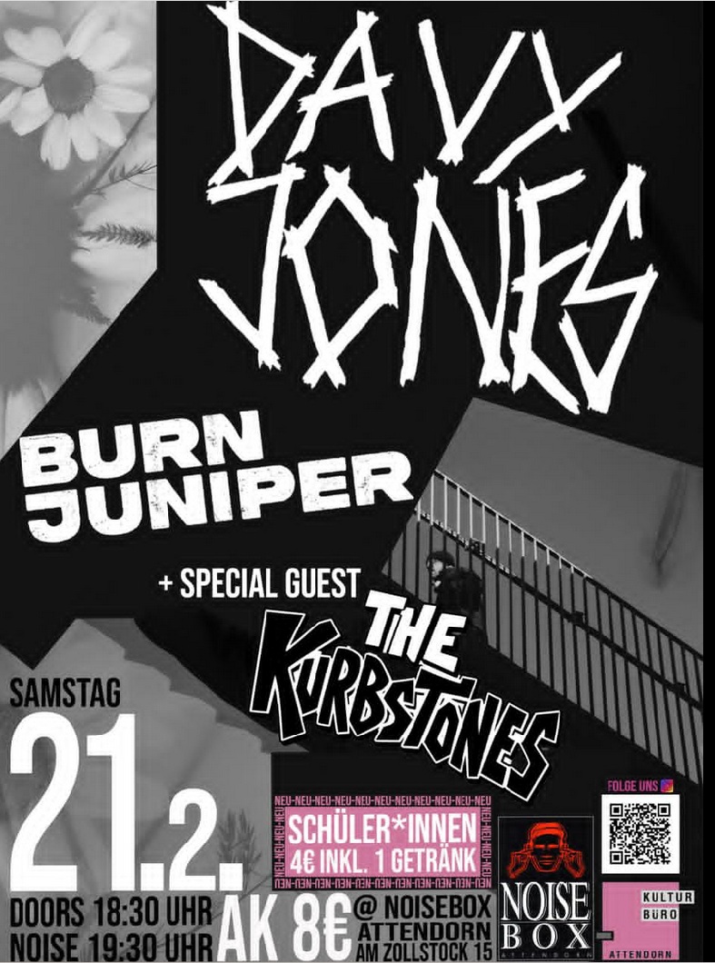 Am 21.02. ab 18:30 Uhr wird die NoiseBox in Attendorn zum Hotspot für ehrliche Gitarrenpower: Davy Jones liefern druckvollen, rotzigen Punkrock mit Vollgas und Mitsing-Refrains, Burn Juniper bringen emotionale Alternative-Sounds mit Tiefgang und Atmosphäre – und als Special Guest steht die junge Nachwuchsband The Kurbstones aus Lennestadt auf der Bühne.